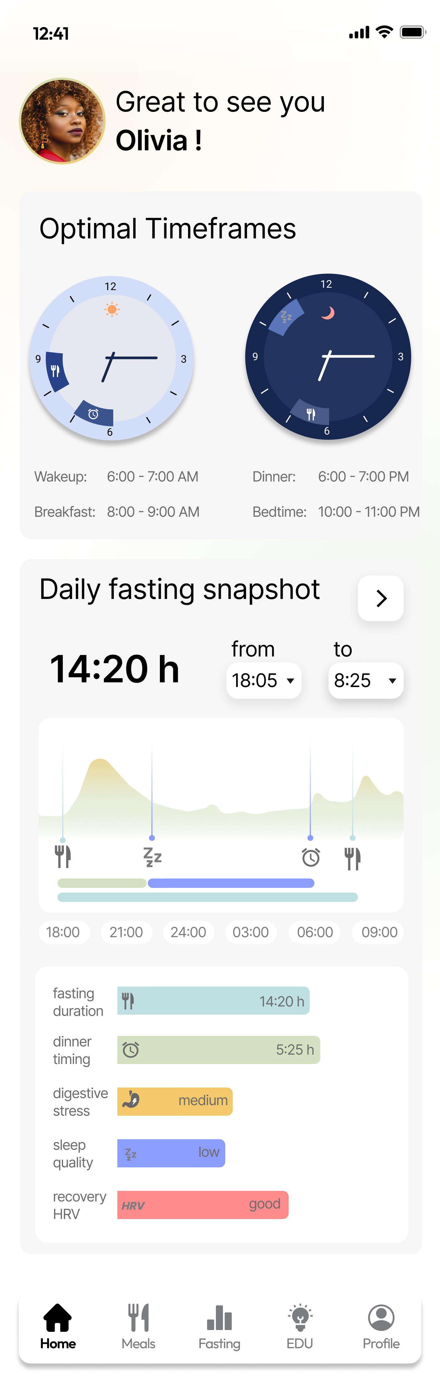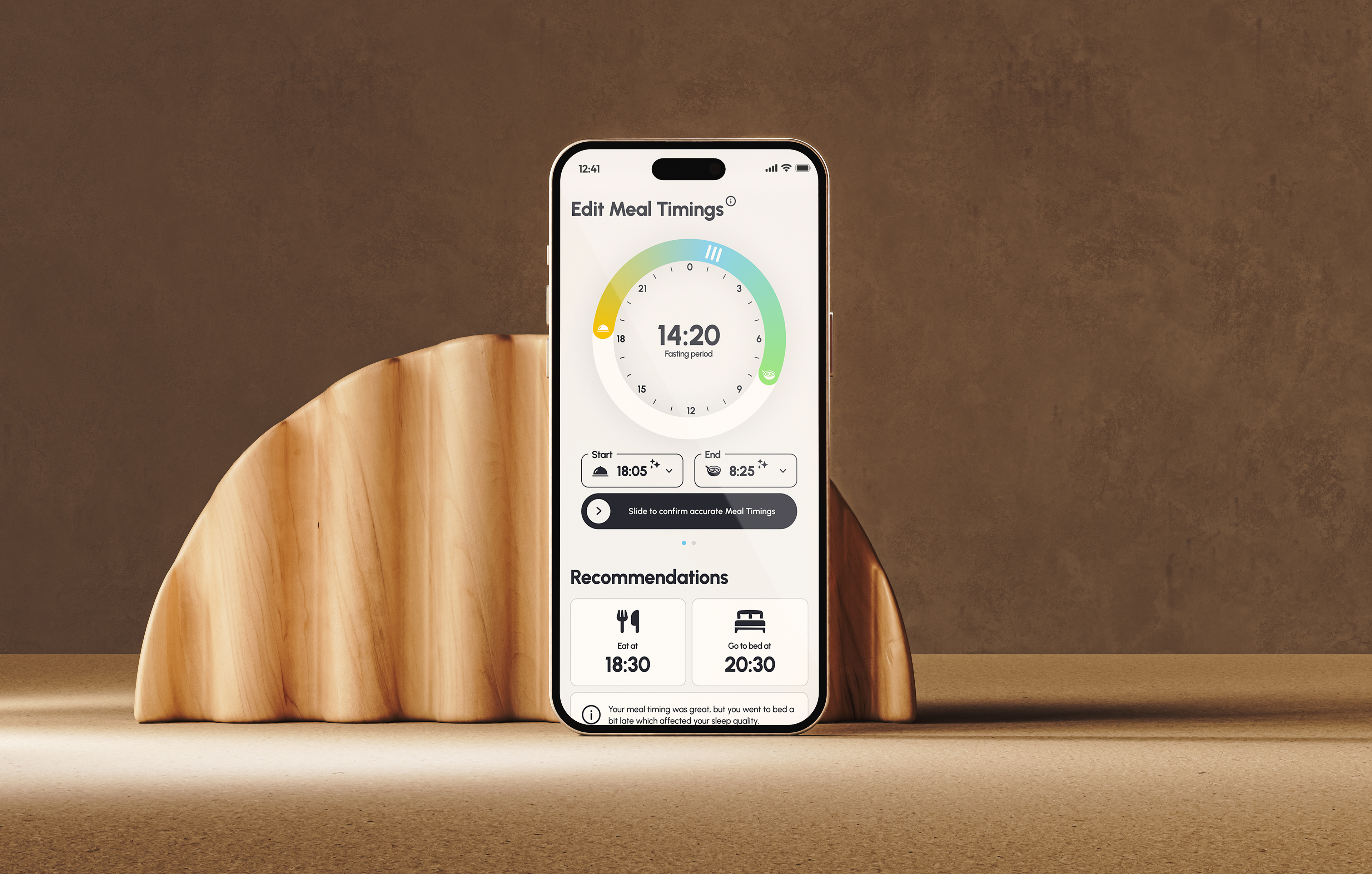 I redesigned the dashboard to bring clarity and structure to Nourify’s most important features. A key part of this was improving how the app presents AI-generated predictions based on Garmin smartwatch data. Start and End times for meal time predictions are now clearly labeled with stars icons. Users can easily adjust these and confirm them through a smooth sliding interaction.