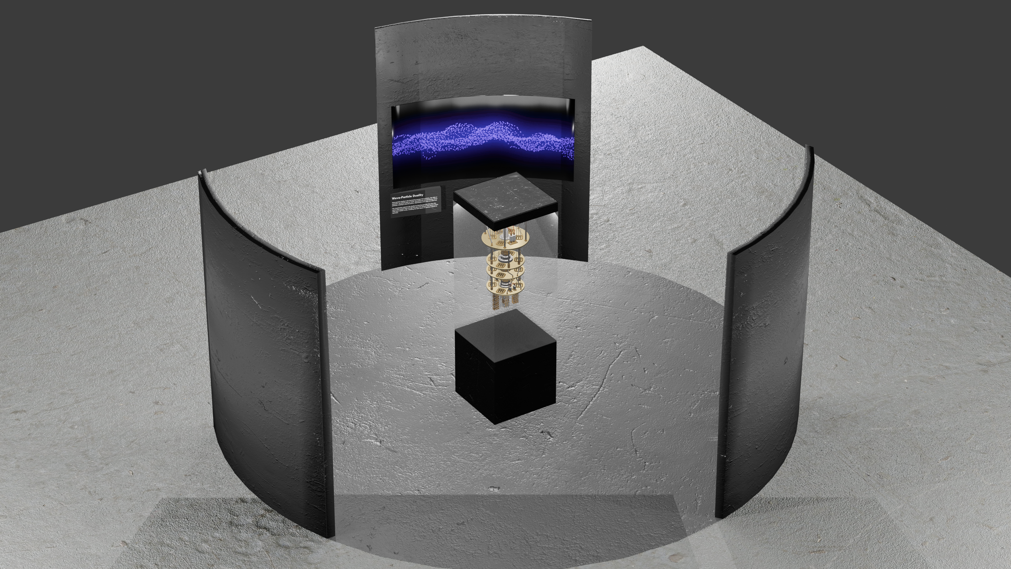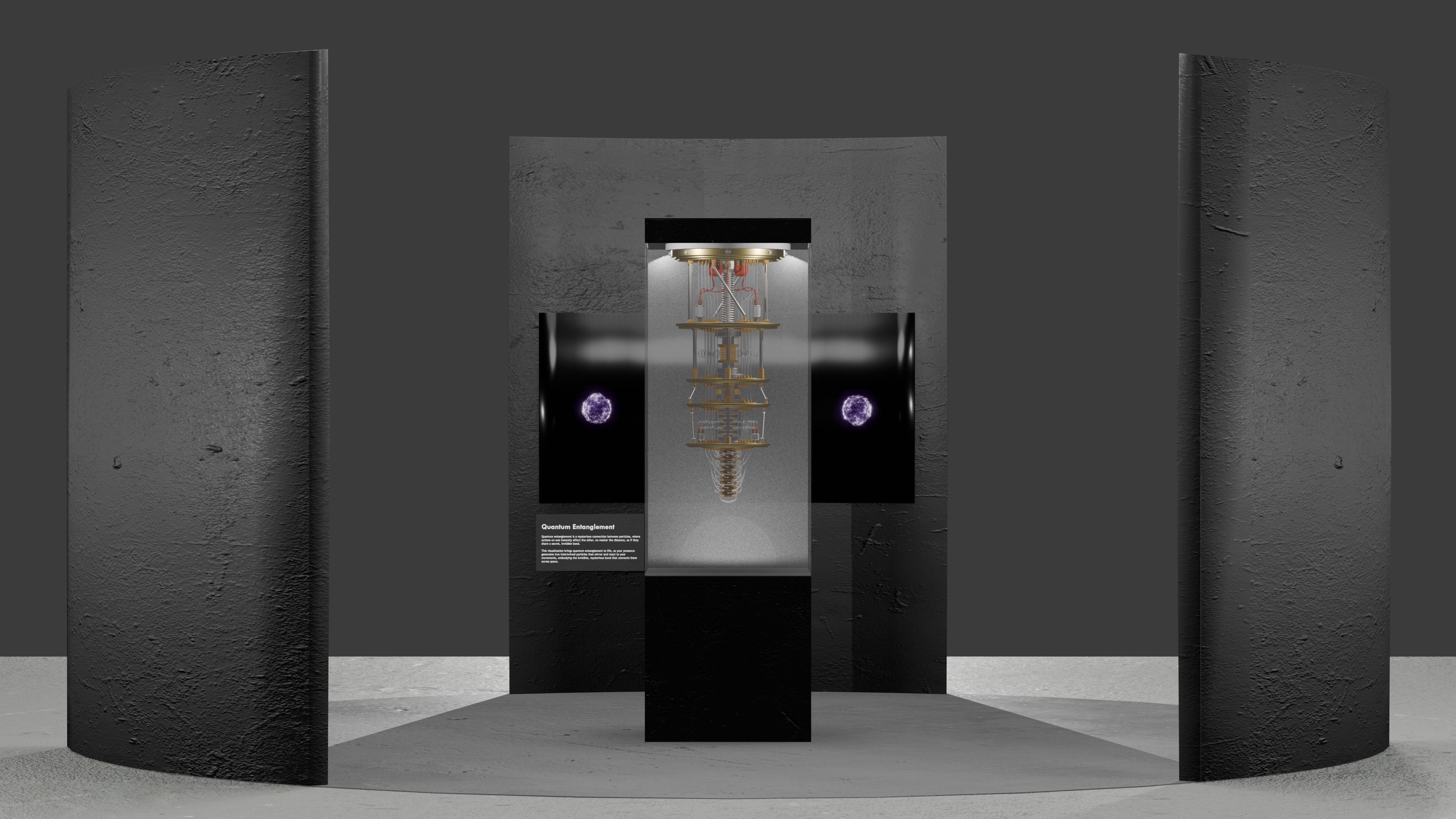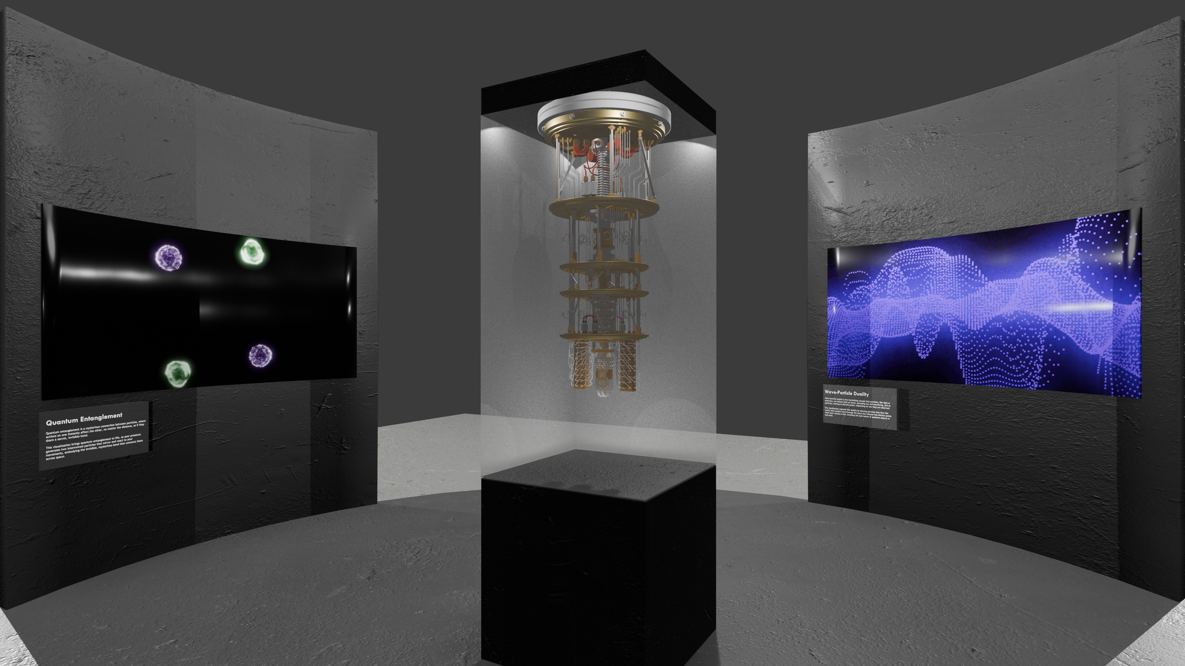 We designed Quantum Realm: a circular, walk-in installation centered around a physical replica of a quantum computer, surrounded by three interactive visualizations, each representing a key concept of quantum mechanics.